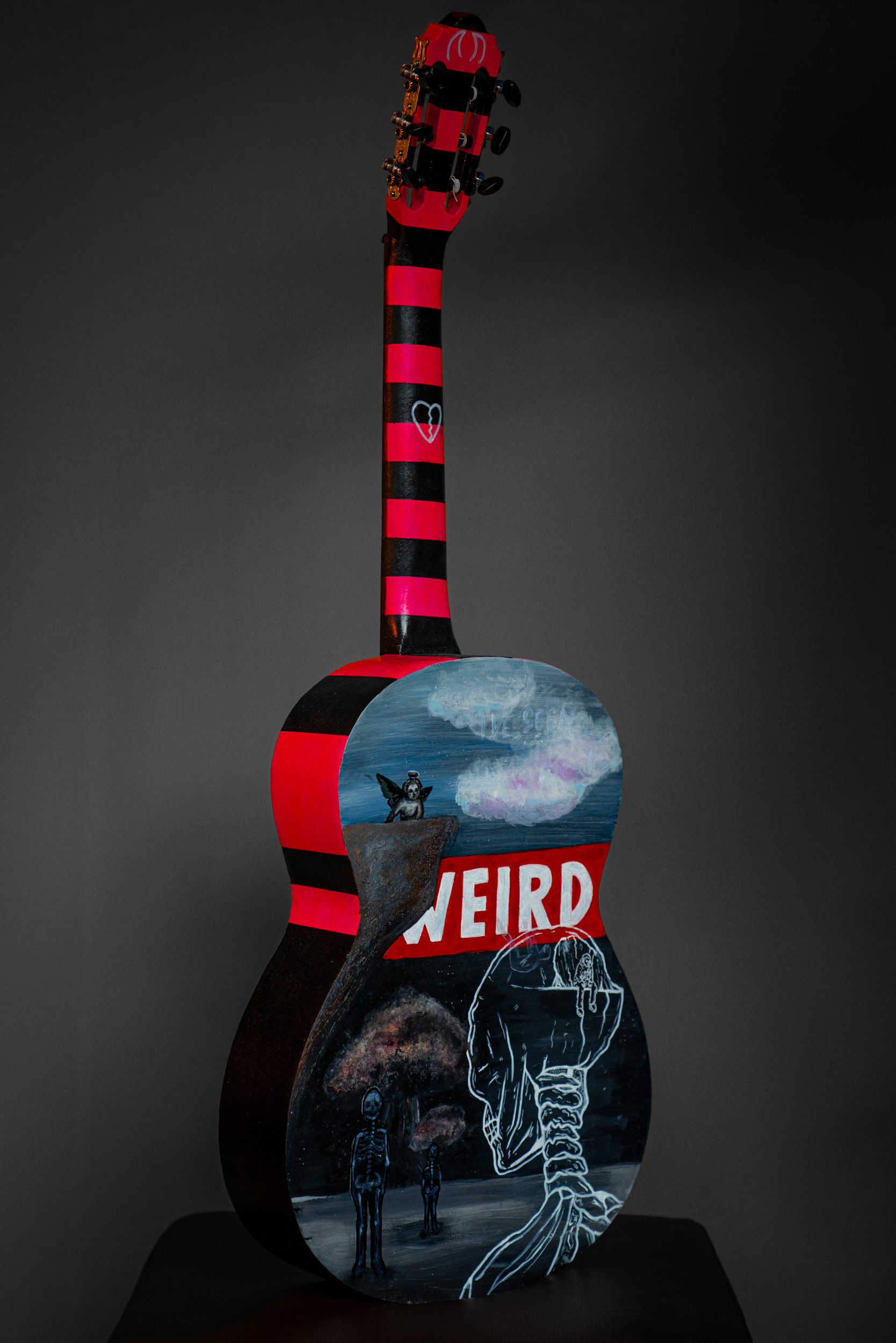 Black and silver tuners complete the guitar, grounding the bold visuals with a clean, sharp finish.