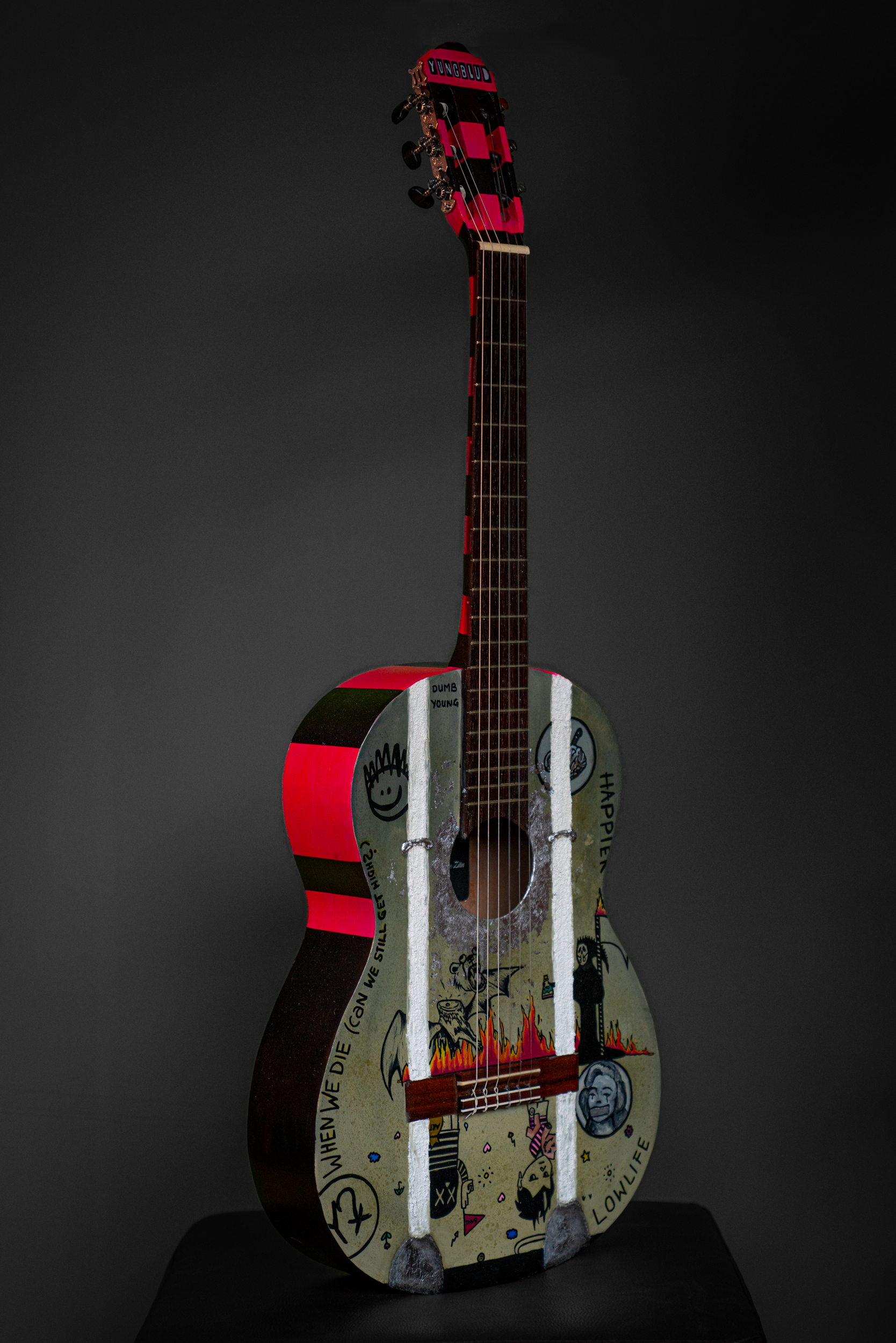 The neck is painted pink with black stripes, referencing YUNGBLUD’s iconic socks and fearless visual identity.